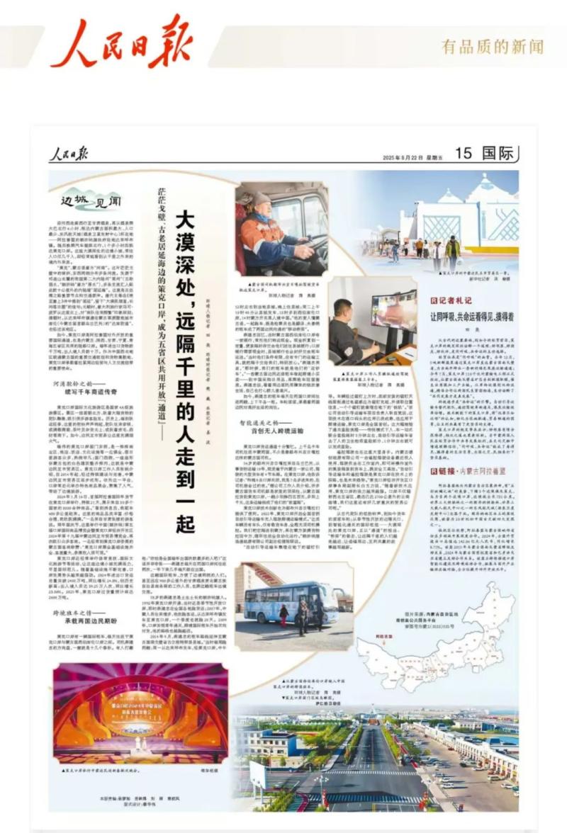 8月22日,《人民日?qǐng)?bào)》國(guó)際版“邊城見(jiàn)聞”專欄整版聚焦阿拉善盟策克口岸,以小故事小切口,見(jiàn)證阿拉善盟與周邊經(jīng)貿(mào)往來(lái)、人文交流的生動(dòng)實(shí)踐,展示了阿拉善盟高水平對(duì)外開(kāi)放取得的豐碩成果,唱響了一曲親誠(chéng)惠容行大道、命運(yùn)與共開(kāi)新篇的贊歌。全文如下: