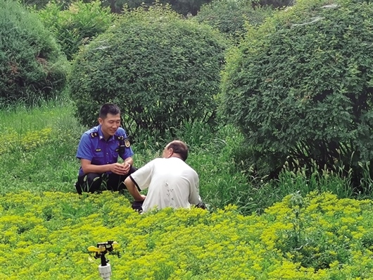 7月26日,包頭市九原區(qū)城市管理綜合執(zhí)法局的執(zhí)法人員發(fā)現(xiàn)一名男子因不適躺在草叢里,聯(lián)系到其家屬后,執(zhí)法人員一直陪伴到老人離開(kāi)。