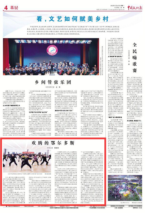 2026年1月26日《中國(guó)文化報(bào)》第4版刊發(fā)了《歡騰的鄂爾多斯》的文章,報(bào)道了廣場(chǎng)舞《歡騰鄂爾多斯》已成為鄉(xiāng)村日?;顒?dòng)、節(jié)慶聚會(huì)的亮點(diǎn)內(nèi)容,讓群星獎(jiǎng)的光芒照亮了基層的舞臺(tái)。作品自惠民演出以來(lái),便以濃郁的民族風(fēng)情和強(qiáng)烈的藝術(shù)表現(xiàn)力深受群眾歡迎。