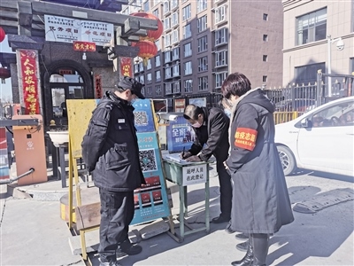 記者跟隨工作人員來到轄區(qū)地新街坊小區(qū),幾名社區(qū)工作人員正在小區(qū)門口負(fù)責(zé)疫情防控,“您好!請問您去哪棟樓?請下車登記信息。謝謝!”“請居民佩戴好口罩”……針對出入小區(qū)的人員,社區(qū)工作人員都一一仔細(xì)核查,宣傳防疫信息?!按汗?jié)長假過后,很多事都堆到今天了,所以格外忙?!卑⒗票甭飞鐓^(qū)黨總支書記王海瓊說,阿拉善北路社區(qū)很多網(wǎng)格員都放棄了與家人團(tuán)聚的時(shí)間,主動下沉到各個(gè)小區(qū)開展疫情防控工作,實(shí)行24小時(shí)輪崗制,做好外地返呼人員登記和掃碼工作,保證轄區(qū)防控安全。除此之外,還積極參與禁燃煙花爆竹、垃圾分類宣傳等工作,讓政策落到實(shí)處。