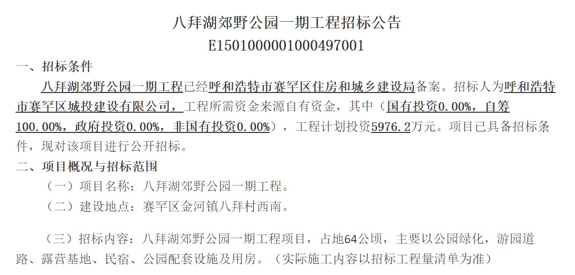 7月5日,記者從呼和浩特市公共資源交易監(jiān)督管理局了解到,八拜湖郊野公園一期工程已經(jīng)呼和浩特市賽罕區(qū)住房和城鄉(xiāng)建設(shè)局備案,項(xiàng)目已具備招標(biāo)條件,啟動公開招標(biāo)。