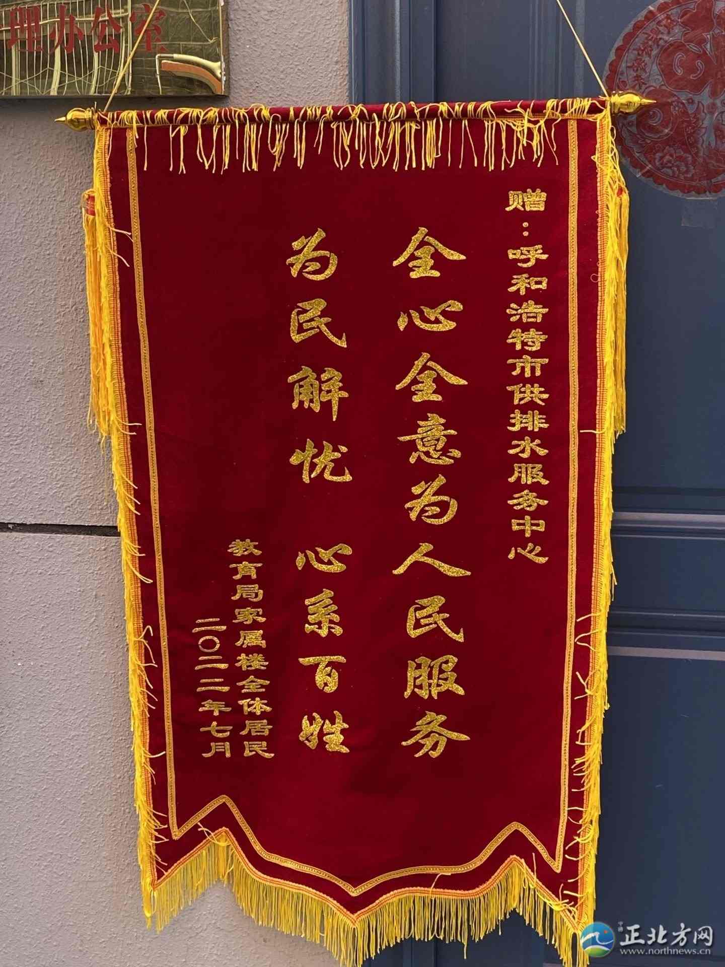 隨后,記者又來(lái)到新城區(qū)教育局宿舍樓,該小區(qū)已經(jīng)改造完畢,居民們已經(jīng)能正常用水了。為了表示感謝,小區(qū)全體居民特地制作了一面錦旗,派居民代表送到呼和浩特市供排水服務(wù)中心。