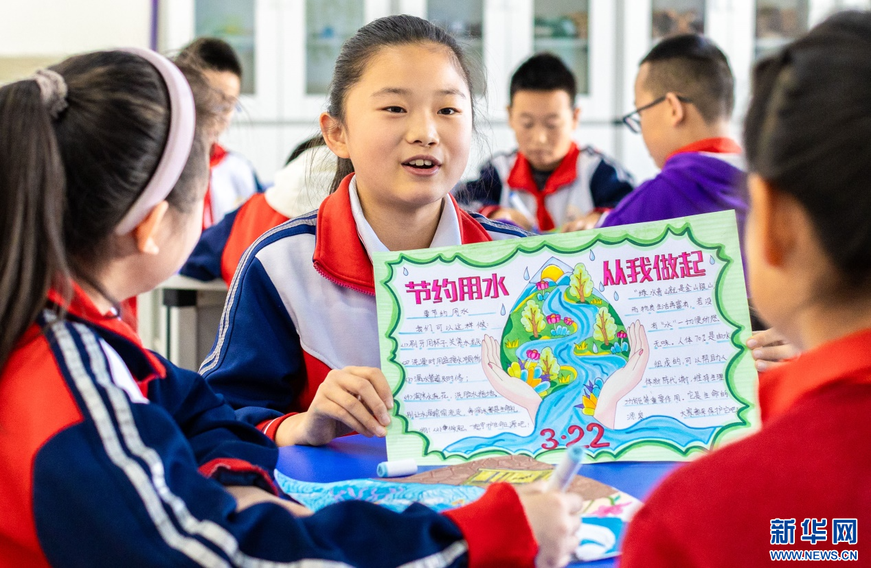 ??3月20日,呼和浩特市玉泉區(qū)石東路小學(xué)學(xué)生在班隊(duì)會(huì)上分享節(jié)水小妙招。新華網(wǎng)發(fā)(丁根厚 攝)