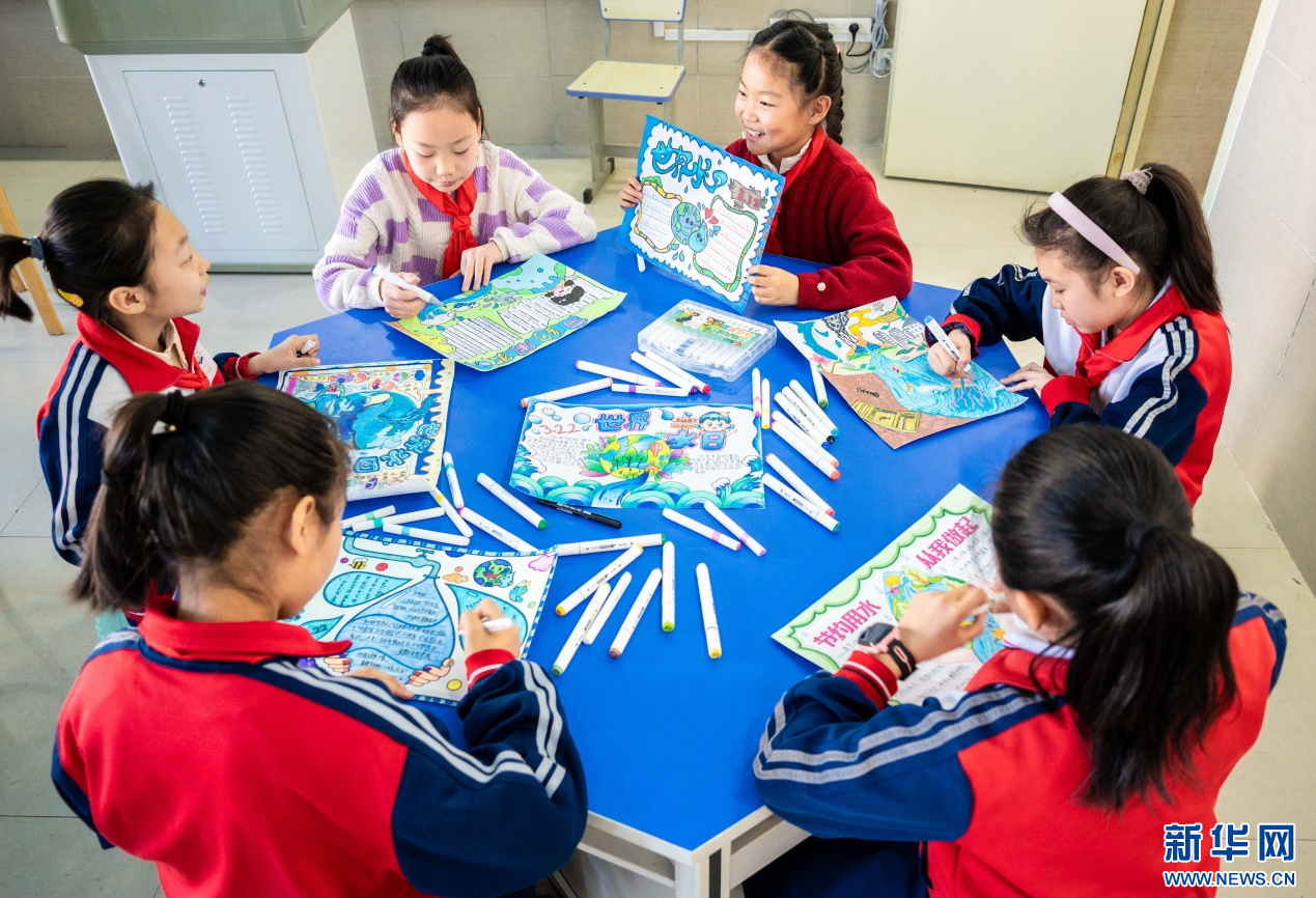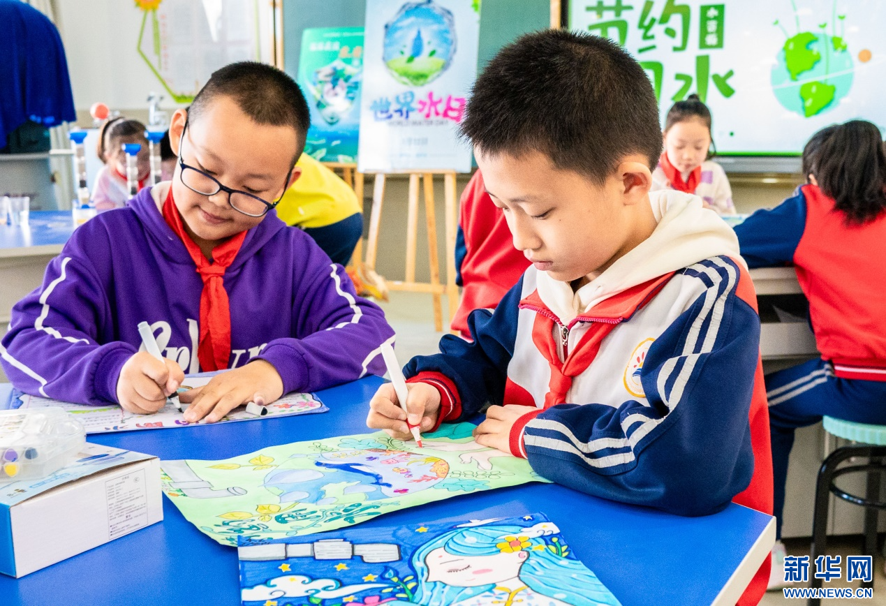 ??3月20日,呼和浩特市玉泉區(qū)石東路小學(xué)學(xué)生在繪制愛(ài)水護(hù)水手抄報(bào)。新華網(wǎng)發(fā)(丁根厚 攝)