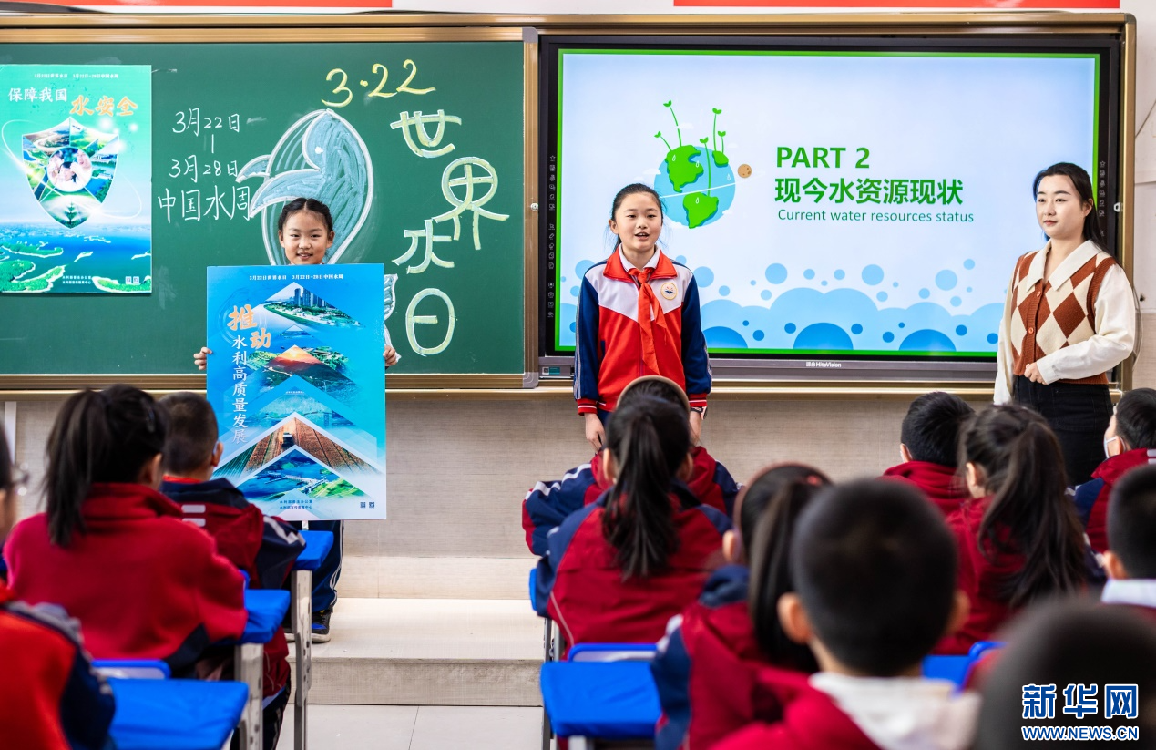 ??3月20日,呼和浩特市玉泉區(qū)石東路小學(xué)老師向?qū)W生們講解“保障我國(guó)水安全”等知識(shí)。新華網(wǎng)發(fā)(丁根厚 攝)