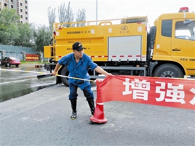 在這之前,通遼市排水管理處已啟動(dòng)應(yīng)急預(yù)案,搶險(xiǎn)人員及應(yīng)急搶險(xiǎn)車輛陸續(xù)就位。負(fù)責(zé)明仁立交橋排水搶險(xiǎn)的第2小組的4名成員兵分兩路,需要?jiǎng)裢藮|、西兩側(cè)準(zhǔn)備過橋的汽車司機(jī)和行人,以及排布車輛、施拉警界線……橋西邊,污水管道維護(hù)隊(duì)車隊(duì)隊(duì)長(zhǎng)張?jiān)僦沁吤χ掷锏幕顑?,邊通過對(duì)講機(jī)呼叫副隊(duì)長(zhǎng)盛博,催促他趕緊向過往的車輛及行人喊話,提醒大家橋下水深不能通行。此時(shí),盛博已駕車由西向東行至立交橋南側(cè)的輔路上,雨水遮住了視線,雨刮器速度越來越快,他邊回應(yīng)張?jiān)僦牵叿怕囁傧蛉藗兒霸挕?/p>