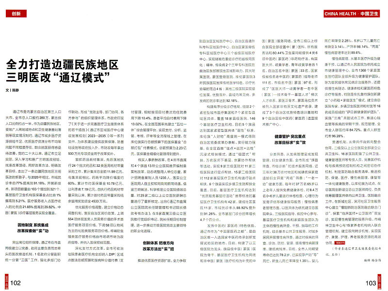 日前,《中國衛(wèi)生》2025年05期刊發(fā)了通遼市衛(wèi)健委主任陳靜同志的署名文章,深度解讀邊疆少數(shù)民族地區(qū)三明醫(yī)改“通遼模式”,這是通遼市衛(wèi)生健康工作首次受到國家衛(wèi)生核心雜志的關(guān)注,標(biāo)志著通遼在衛(wèi)生健康領(lǐng)域的創(chuàng)新實踐獲國家級權(quán)威認(rèn)可。