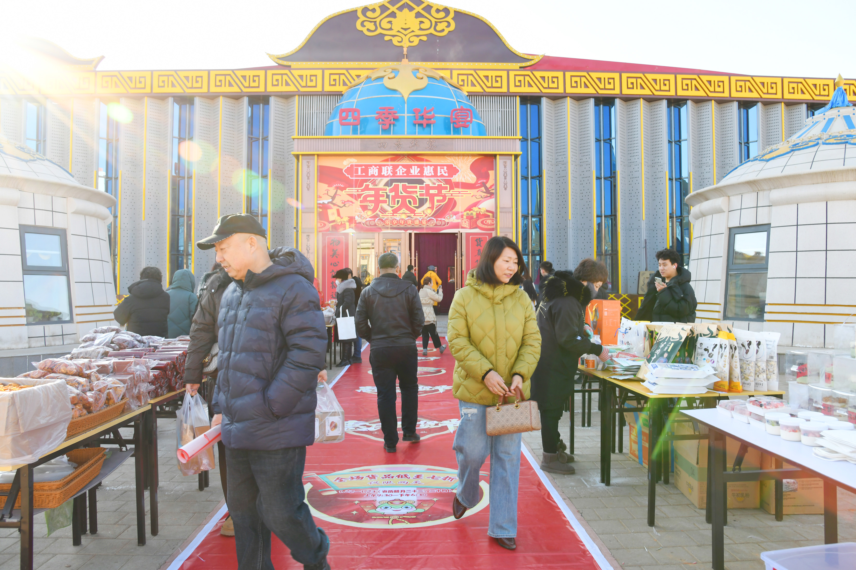 “肘子、熏雞、麻花、糖棗、奶豆腐!”“現(xiàn)出鍋醬牛肉,肥嫩多汁,快來嘗嘗!”……1月22日,工商聯(lián)惠民年貨節(jié)在集寧區(qū)察哈爾部落?四季華宴火熱開市。