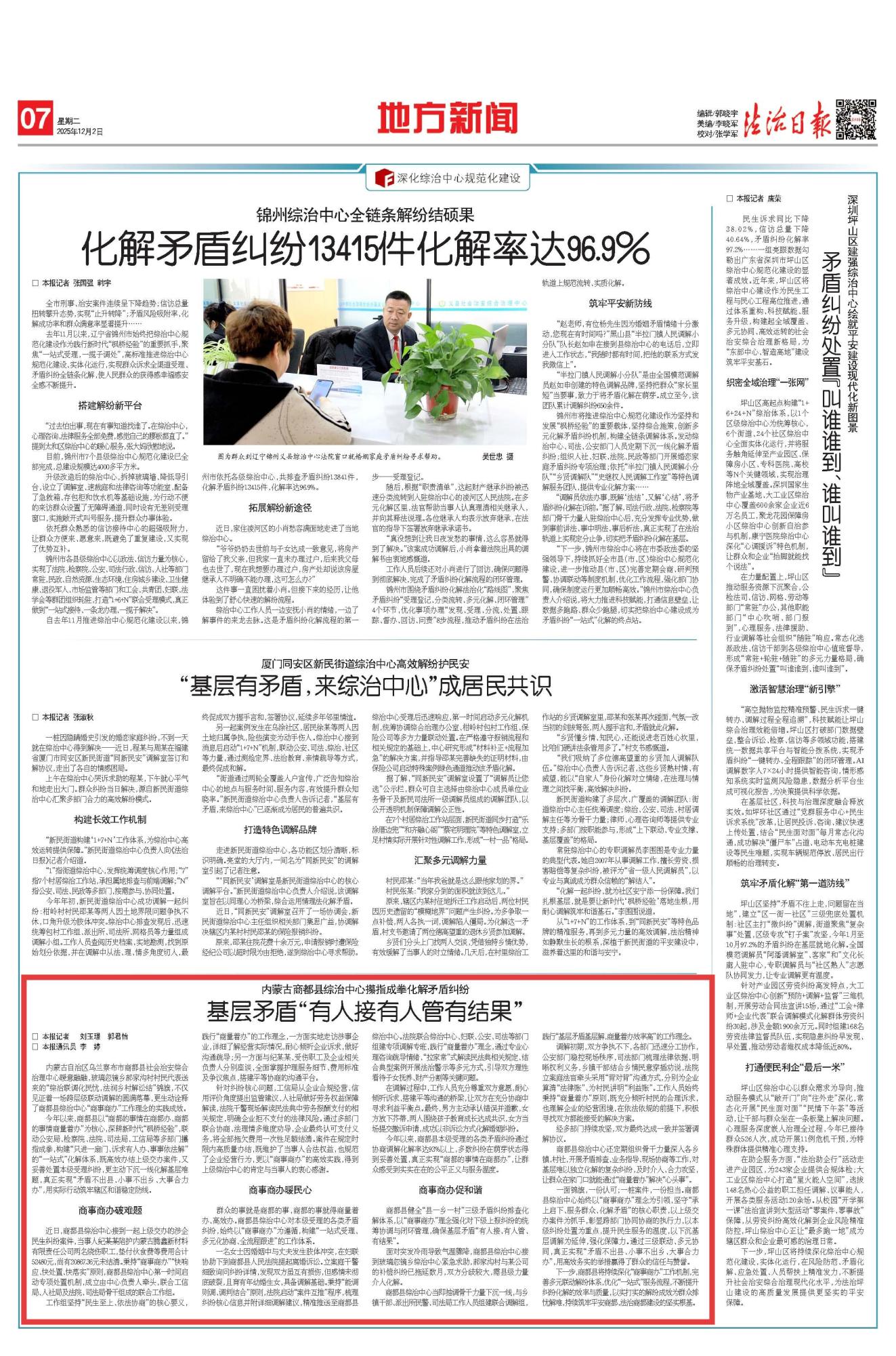 2025年12月2日,《法治日報》第7版刊發(fā)題為《內(nèi)蒙古商都縣綜治中心攥指成拳化解矛盾糾紛 基層矛盾“有人接有人管有結(jié)果”》的文章,報道了內(nèi)蒙古商都縣以“商都的事情在商都辦、商都的事情商量著辦”為核心,聯(lián)動公安局、檢察院、法院、司法局、工信局等多部門攥指成拳,構(gòu)建“只進(jìn)一扇門、訴求有人辦、事事依法解”的“一站式”化解體系,用實際行動筑牢轄區(qū)和諧穩(wěn)定防線。