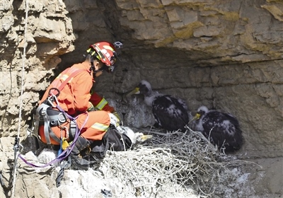 當天7時左右,在烏海市海勃灣區(qū)甘德爾山景區(qū)半山腰處,攝影愛好者焦長青在拍攝時發(fā)現(xiàn)了一窩出生20多天的幼年野生黑鸛,其中一只黑鸛行動異常,疑似受傷。他立即撥打了119報警電話,同時聯(lián)系了烏海市野生動物保護部門。9時許,烏海市消防支援支隊光明路特勤站和烏海市野生動物保護部門的工作人員到達現(xiàn)場。經勘查,在距離懸崖正下方大約30米處的巖洞內,一只幼年黑鸛被尼龍繩纏繞住腿部而受傷,不能行動。消防員隨后尋找合適的位置制作錨點。消防員陳意攜帶救援裝備速降到懸崖下方展開營救,一個小時之后,受傷的幼年黑鸛被成功救出,并送往海勃灣區(qū)林業(yè)草原局救助站進行救治。
