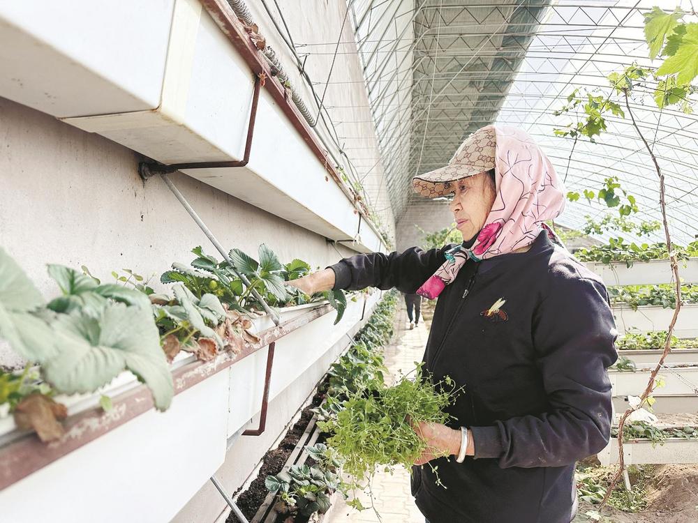 走進草莓大棚內(nèi),濃濃的暖意撲面而來。抬眼望去,離地一米多的種植架上種滿了生機勃勃、長勢喜人的草莓;穿梭在種植架間,一顆顆鮮紅欲滴、圓潤飽滿的草莓宛如璀璨的紅寶石,從綠葉間“探出頭”來,高高地懸掛在空中,散發(fā)著誘人的清香。種植戶牛尚海正在察看采用立體栽培技術(shù)的草莓長勢情況?!斑@是一種三維立體種植方式,能夠充分利用空間和光照,大幅度提高生產(chǎn)效率。以前一畝地最多種8000株,現(xiàn)在能種2.4萬株,產(chǎn)量提高了3倍,而且草莓個頭更均勻,賣相更好?!迸I泻8嬖V記者,這種種植方式不僅省工、省力,還降低了勞動強度,摘草莓也不用彎腰了。此外,這種種植模式比傳統(tǒng)種植模式每畝節(jié)水50%。