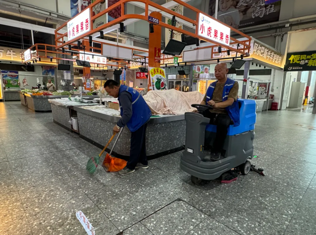 記者在現(xiàn)場看到,市場內(nèi)燈火通明,幾名保潔人員正在細致地擦拭攤位,有的則在清掃地面上的雜物。而在市場的主通道上,工作人員羅全貴正開著洗地機緩緩前行,機器過后,原本有些油污的地面變得干凈整潔。