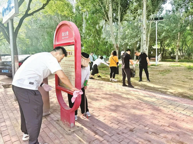 現(xiàn)場,大家迅速分工,有的拿著垃圾袋撿拾路邊的煙頭、紙屑等垃圾;有的拿著抹布,認真地擦拭公交站牌和果皮箱;還有的則在清理路邊綠化帶里的雜物。大家各司其職,干勁十足,不一會兒就汗流浹背。