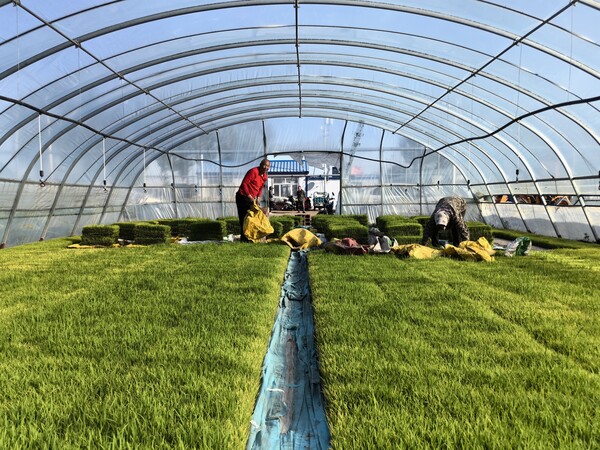 水稻種植戶將秧苗擺放在編織袋上,等待無人機運送