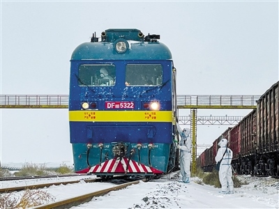 11月6日,二連出入境邊防檢查站執(zhí)勤民警頂風(fēng)冒雪,對通關(guān)列車進(jìn)行檢查驗(yàn)放。日前,二連浩特市出現(xiàn)降雪、強(qiáng)降溫天氣,最低溫度降至零下15℃。二連出入境邊防檢查站民警積極做好惡劣天氣下疫情防控、通關(guān)服務(wù)保障工作,全力保障口岸通關(guān)安全順暢。(記者 安寅東 攝)