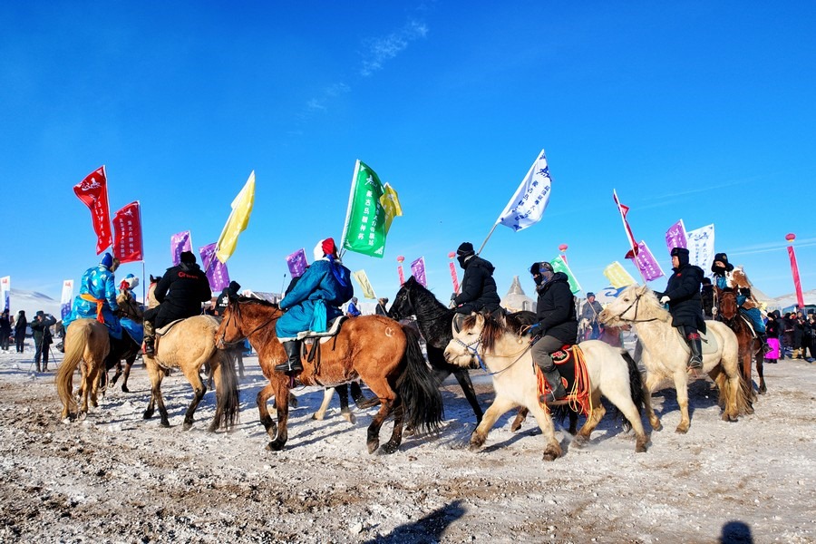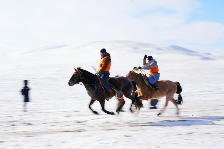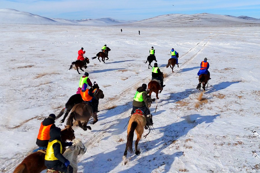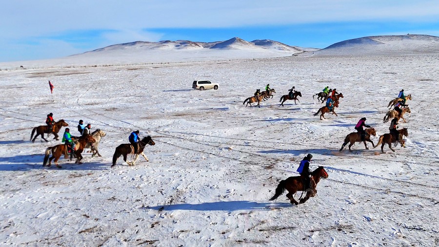 隨著裁判一聲令下,馬匹奮蹄疾行,冬日草原也被這激情瞬間引燃。騎手們也盡顯高超的騎術,不甘落后、彼此反超,高潮迭起。