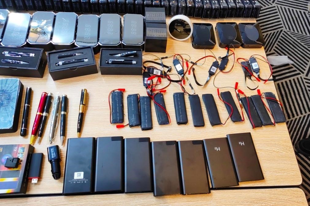 這是民警繳獲的偽裝成各類生活用品的竊聽竊照器材。(饒河縣公安局供圖)