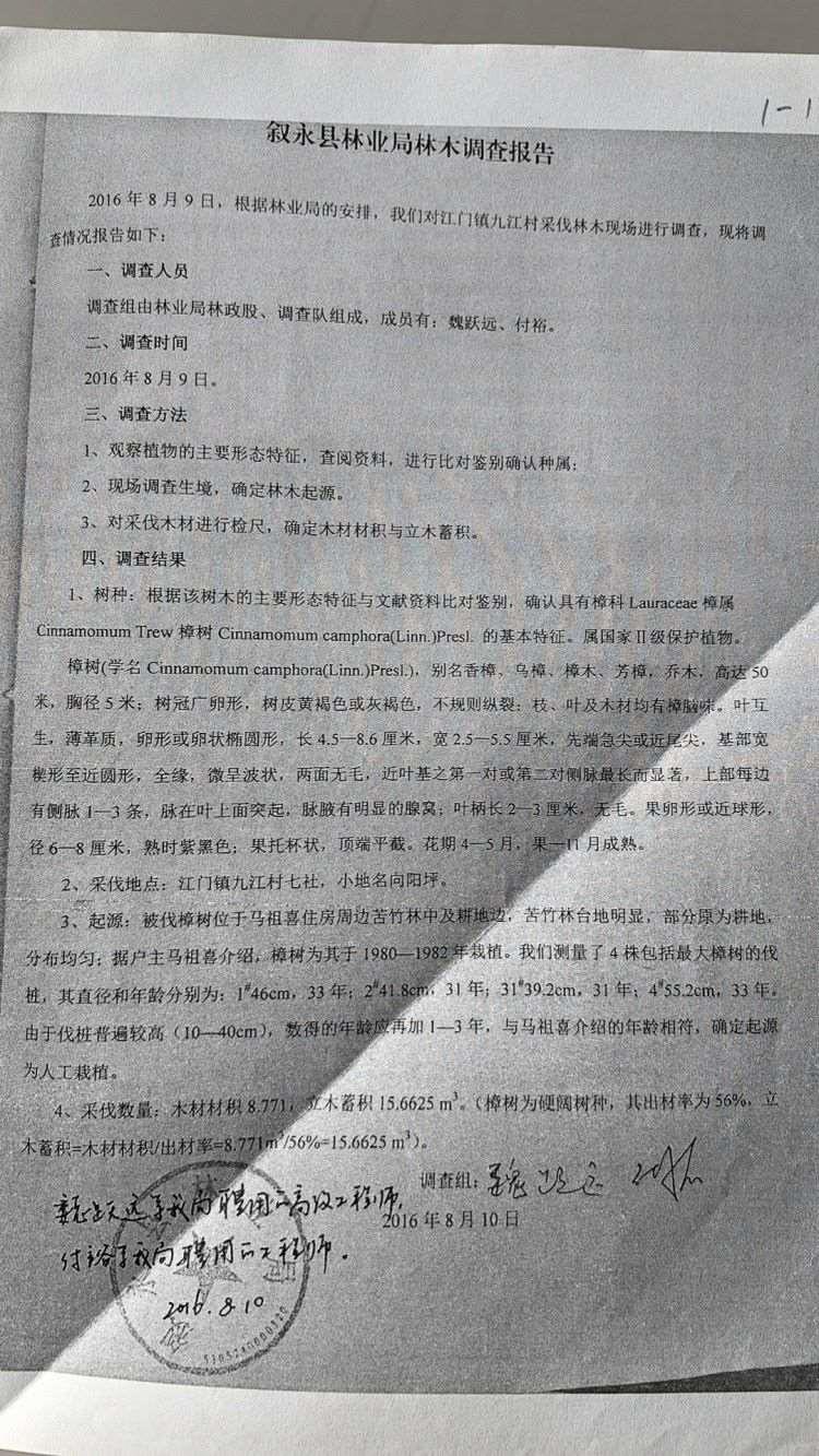 敘永縣林業(yè)局出具的報告顯示,涉案香樟樹為人工栽植。圖片來源/受訪者供圖