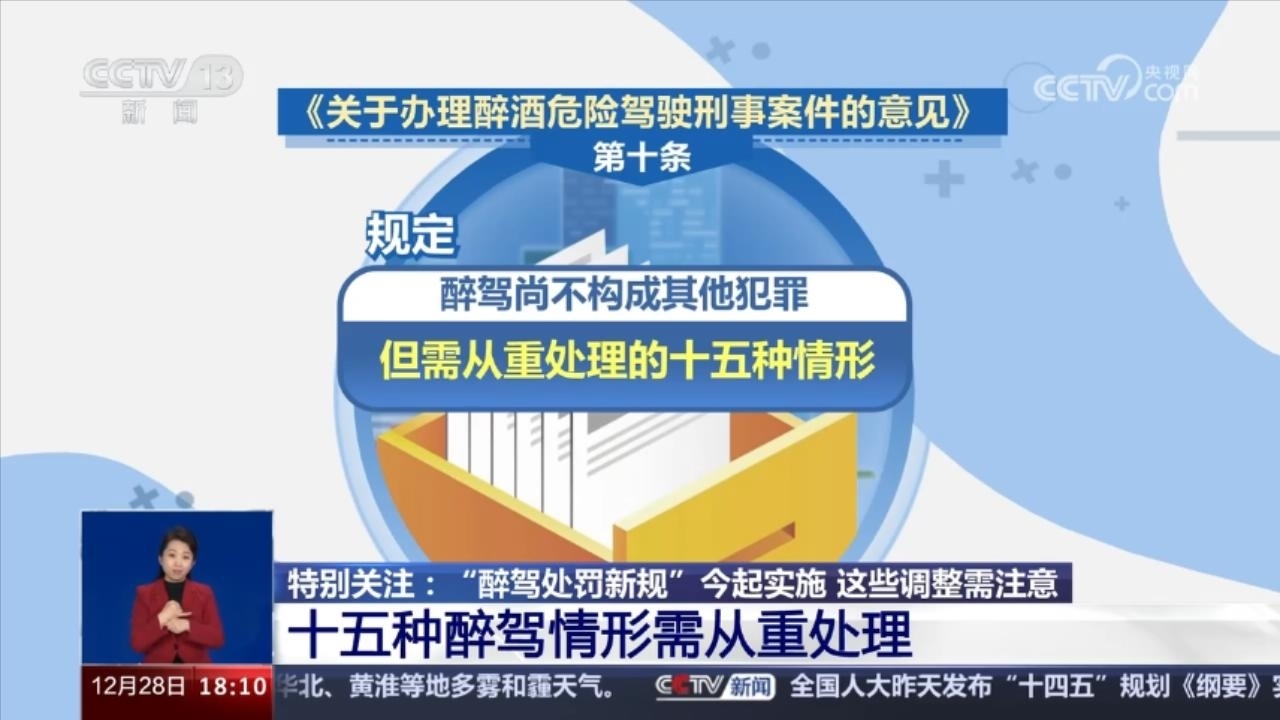 央視網(wǎng)消息:12月28日開始,《關(guān)于辦理醉酒危險(xiǎn)駕駛刑事案件的意見》,俗稱“醉駕處罰新規(guī)”正式實(shí)施。此前,《意見》由最高人民法院、最高人民檢察院、公安部、司法部聯(lián)合發(fā)布。