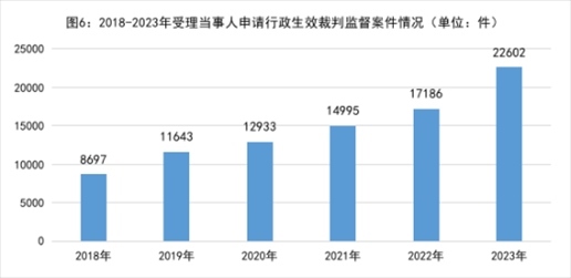 1.依申請監(jiān)督的行政生效裁判監(jiān)督案件數(shù)量逐年上升,反映出人民群眾對檢察監(jiān)督的更高需求。2018年以來當事人不服法院生效裁判向檢察機關(guān)申請監(jiān)督的案件分別是:2018年8697件、2019年11643件、2020年12933件、2021年14995件、2022年17186件、2023年22602件,年均增加21%。2023年16個省級檢察院受理行政案件數(shù)超過民事案件。當事人對裁判結(jié)果申請監(jiān)督的同時,很多情況下還對審判和執(zhí)行程序一并主張訴求,追求“看得見”的公平正義。