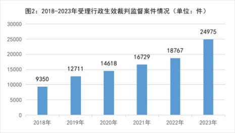 2.行政生效裁判監(jiān)督力度加大,質(zhì)效向好。2018年以來辦理行政生效判決、裁定、調(diào)解書監(jiān)督案件分別是:2018年9350件、2019年12711件、2020年14618件、2021年16729件、2022年18767件、2023年24975件,年均增加21.7%。2023年辦理數(shù)同比上升33.1%,較2018年上升1.7倍。其中,依申請辦理占90.5%;依職權(quán)辦理占9.5%。對認為確有錯誤的生效裁判,提出抗訴192件,同比上升17%,同期法院審結(jié)改變率82.2%,同比增加2.9個百分點;提出再審檢察建議432件,同期法院采納率為91.7%,同比增加18.4個百分點;同步向行政機關(guān)提出檢察建議6900件,占提出監(jiān)督意見數(shù)的91.7%。