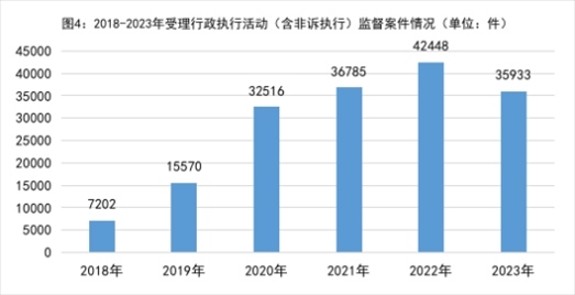 4.行政執(zhí)行活動監(jiān)督發(fā)展迅速,行政非訴執(zhí)行監(jiān)督占主導。2018年以來受理行政執(zhí)行活動(含非訴執(zhí)行)監(jiān)督案件分別是:2018年7202件、2019年15570件、2020年32516件、2021年36785件、2022年42448件,年均增加55.8%。2023年受理35933件,同比下降15.3%。其中,行政非訴執(zhí)行活動監(jiān)督34938件,占97.2%;行政訴訟執(zhí)行活動監(jiān)督995件,占2.8%。針對超期執(zhí)行、執(zhí)行裁定或決定違反法定程序、違法裁定終結(jié)本次執(zhí)行、怠于申請強制執(zhí)行等問題,向法院、行政機關(guān)提出檢察建議31790件,同比下降12.8%。