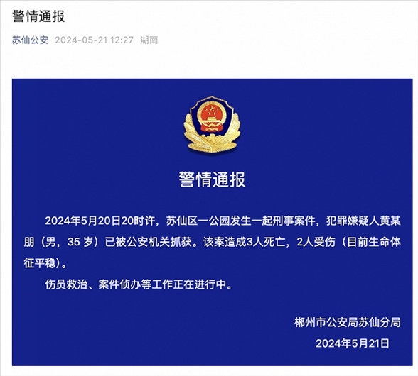 央視網消息:據蘇仙公安微信公眾號消息,5月20日20時許,蘇仙區(qū)一公園發(fā)生一起刑事案件,犯罪嫌疑人黃某朋(男,35歲)已被公安機關抓獲。該案造成3人死亡,2人受傷(目前生命體征平穩(wěn))。傷員救治、案件偵辦等工作正在進行中。