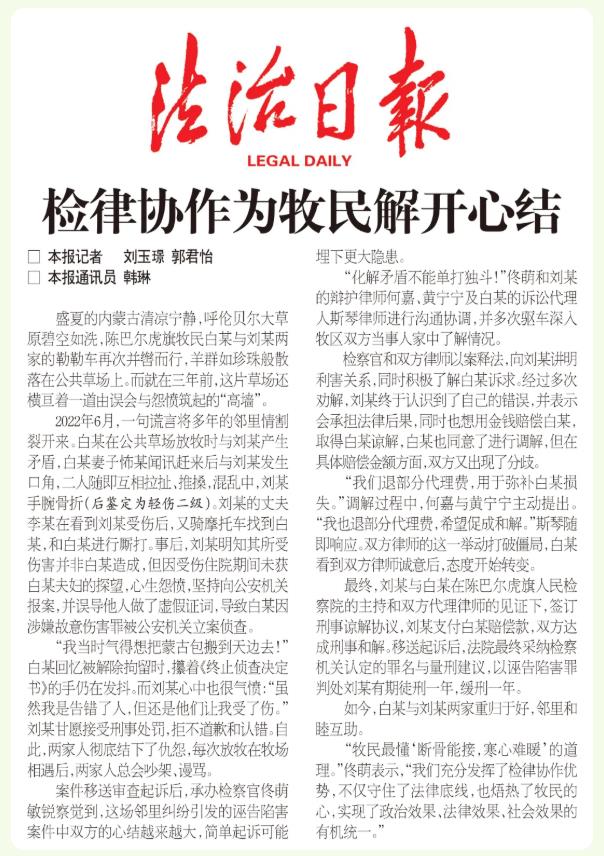 “牧民最懂‘?dāng)喙悄芙?,寒心難暖’的道理?!辟∶缺硎?,“我們充分發(fā)揮了檢律協(xié)作優(yōu)勢,不僅守住了法律底線,也焐熱了牧民的心,實現(xiàn)了政治效果、法律效果、社會效果的有機統(tǒng)一。”(作者 劉玉璟 郭君怡 韓琳)