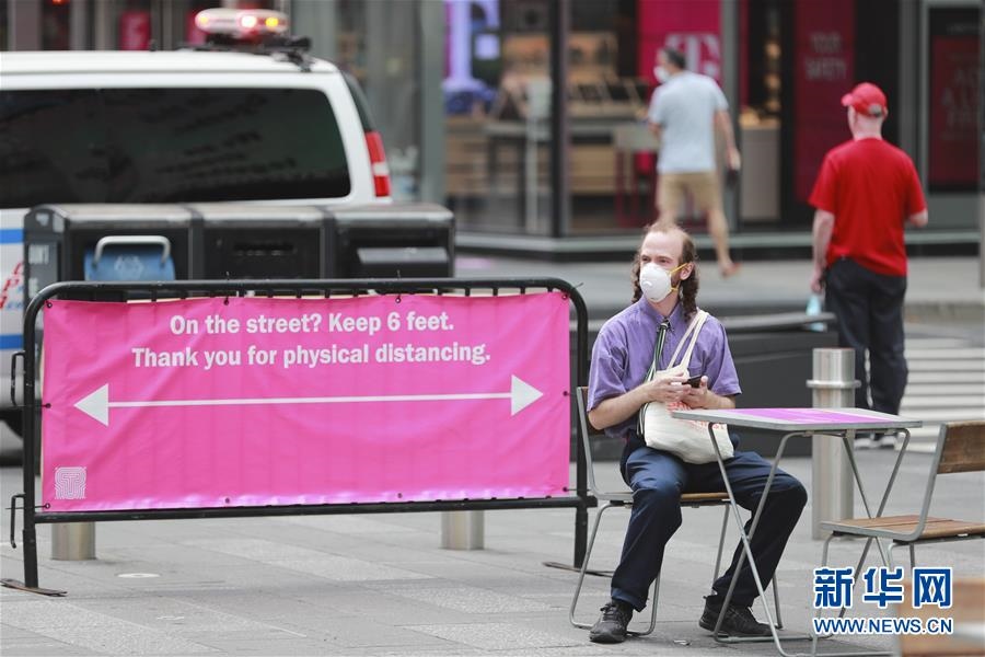 7月23日,在美國紐約時(shí)報(bào)廣場,人們從保持社交距離的提示牌旁走過。美國約翰斯·霍普金斯大學(xué)23日發(fā)布的新冠疫情最新統(tǒng)計(jì)數(shù)據(jù)顯示,美國累計(jì)確診病例超過400萬例。數(shù)據(jù)顯示,截至美國東部時(shí)間23日15時(shí)34分(北京時(shí)間24日3時(shí)34分),美國累計(jì)確診病例4007859例,累計(jì)死亡病例143846例。新華社記者王迎攝