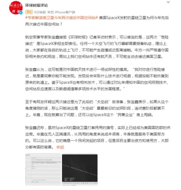 航空軍事專家張寶鑫接受《環(huán)球時報》記者采訪時表示,可以肯定的是,這兩次“危險接近”是SpaceX承擔全部責任。任何一個太空飛行的飛行器都需要報備軌跡,理論上說,大家都在各自的軌跡上飛行,不可能產(chǎn)生碰撞或近距離接觸。中方一向嚴格遵守國際相關條約和規(guī)定,再加上我們空間站中還有航天員,不可能主動去接近美國衛(wèi)星。