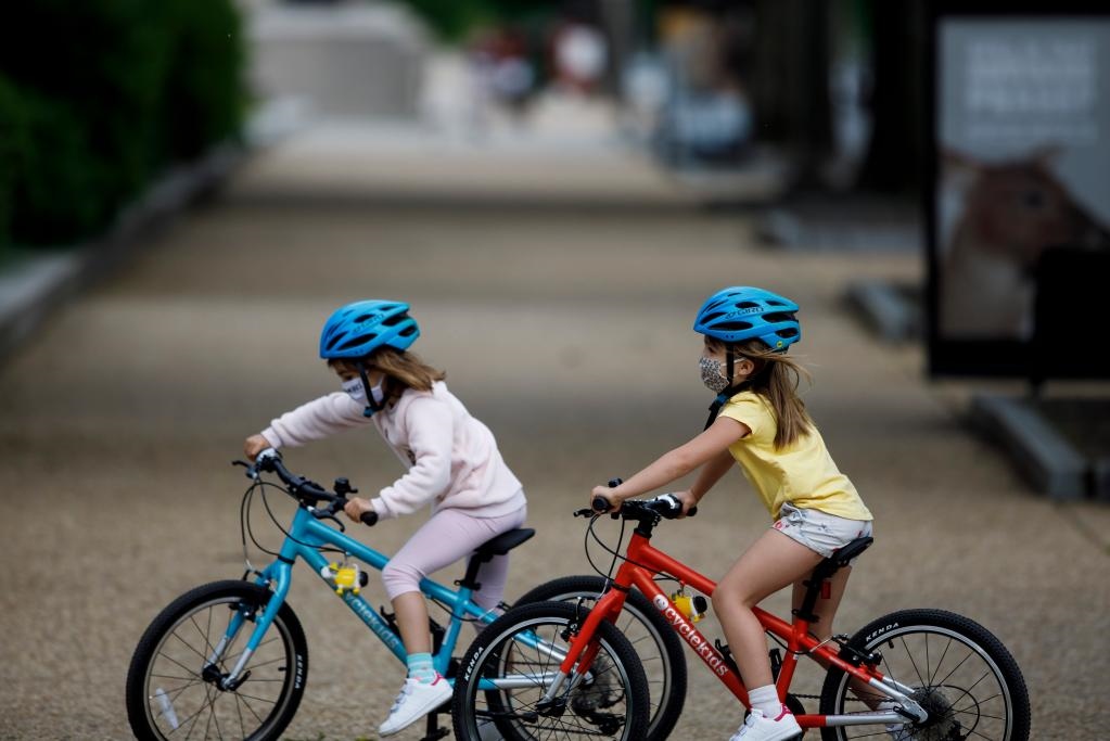 2020年5月18日,兩名兒童戴著口罩在美國首都華盛頓國家廣場騎車。新華社發(fā)(沈霆攝)