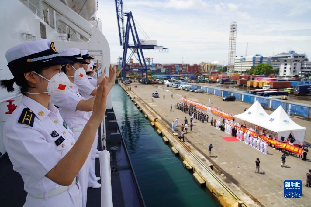 11月18日,在印度尼西亞首都雅加達(dá)的丹戎不碌港,中國(guó)海軍“和平方舟”號(hào)醫(yī)院船官兵向送行人員揮手告別。新華社發(fā)(孫飛 攝)
