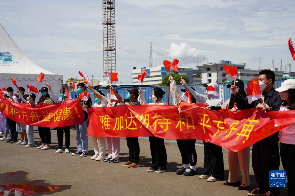 11月18日,在印度尼西亞首都雅加達(dá)的丹戎不碌港,送行人員向中國(guó)海軍“和平方舟”號(hào)醫(yī)院船揮手告別。新華社發(fā)(孫飛 攝)