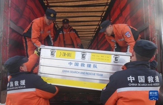2月16日,在土耳其哈塔伊省安塔基亞市,中國救援隊(duì)隊(duì)員搬運(yùn)設(shè)備。