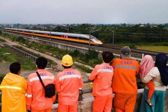 2022年11月16日,在印度尼西亞萬隆,雅萬高鐵建設(shè)者和當?shù)孛癖娪^看高速鐵路綜合檢測車行駛在雅萬高鐵試驗段(無人機照片)。新華社發(fā)(李培養(yǎng) 攝)
