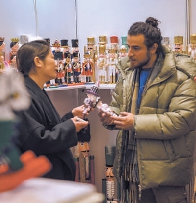 2023年2月24日,一名外商(右)正在中國(guó)(臺(tái)州)“一帶一路”跨國(guó)采購(gòu)對(duì)接會(huì)上了解產(chǎn)品。章勇濤攝(人民視覺(jué))