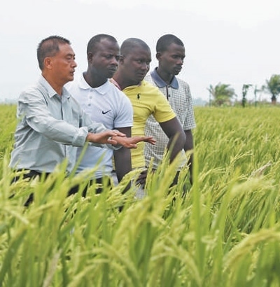 2022年10月29日,中國(guó)水稻專(zhuān)家但松柏(左一)在布隆迪布班扎省基航加縣指導(dǎo)當(dāng)?shù)剞r(nóng)民種植水稻。董江輝攝(新華社發(fā))
