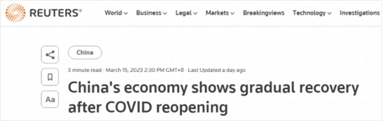 路透社也在15日的報(bào)道表示,盡管全球需求及房地產(chǎn)行業(yè)持續(xù)低迷,但2023年前兩個(gè)月中國經(jīng)濟(jì)活動(dòng)在消費(fèi)和基礎(chǔ)設(shè)施投資的推動(dòng)下穩(wěn)步回升,從疫情的影響中恢復(fù)。