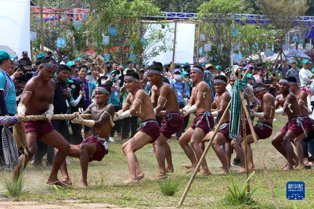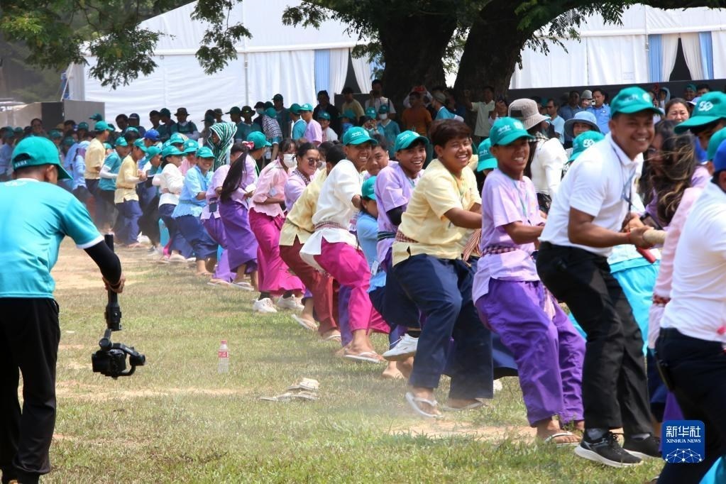 4月14日,在柬埔寨暹粒吳哥古跡內(nèi),人們在宋干節(jié)慶?;顒由蠀⑴c傳統(tǒng)拔河游戲。