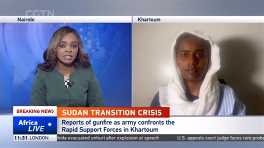 △4月15日,CGTN喀土穆報(bào)道員Naba Mohiedeen 就軍事沖突進(jìn)行直播報(bào)道