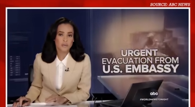 (安柏然所發(fā)視頻中,一名美媒主持人報道美國在夜間出動直升機(jī)撤離美國外交官的畫面。)