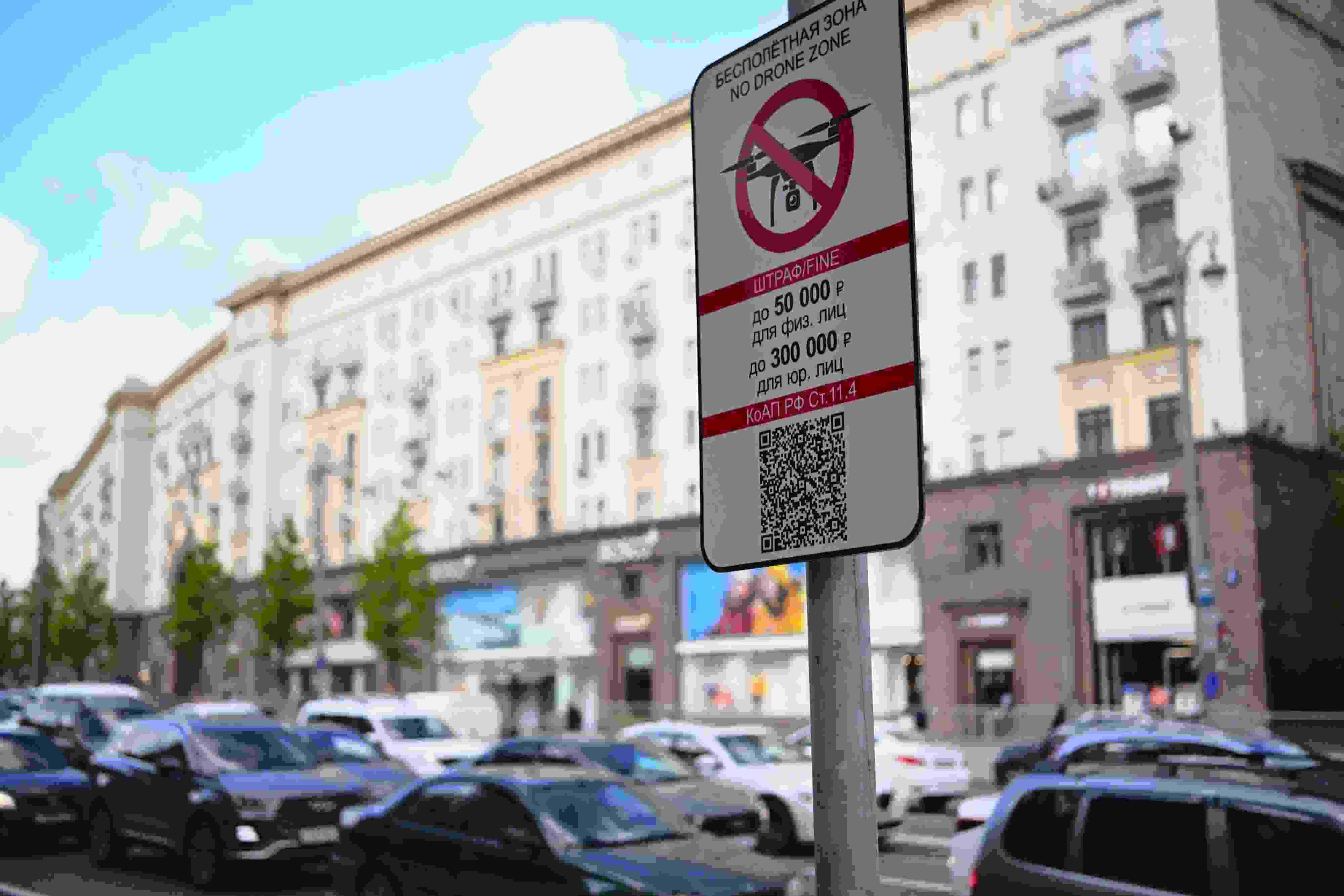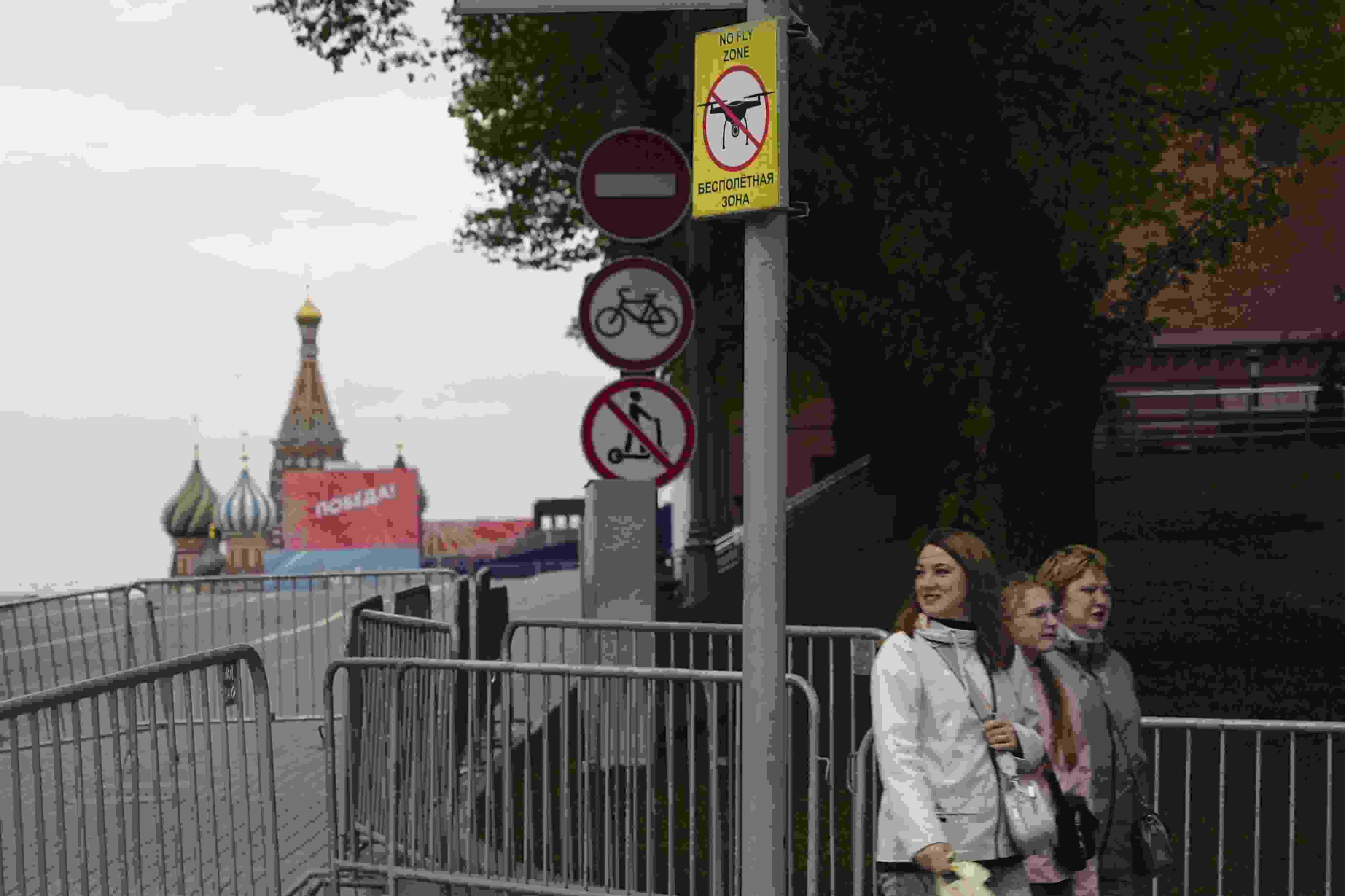 當(dāng)?shù)貢r(shí)間2023年5月3日,俄羅斯莫斯科,莫斯科市中心懸掛的“無人駕駛飛機(jī)禁飛區(qū)”的標(biāo)志,禁止無人機(jī)在該地區(qū)飛行??死锬妨謱m遭無人機(jī)襲擊后,莫斯科市長宣布禁止未經(jīng)授權(quán)的無人機(jī)在俄羅斯首都上空飛行。 視覺中國