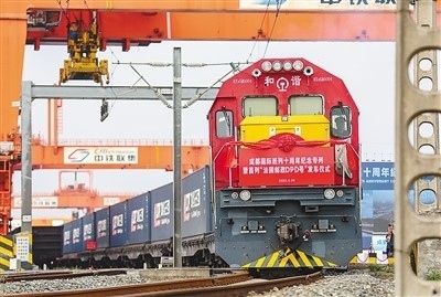 中歐班列是中法進(jìn)出口貿(mào)易的重要橋梁。圖為4月26日,為紀(jì)念成都國(guó)際班列十周年而開(kāi)行的“法國(guó)郵政DPD專列”在四川省成都市青白江區(qū)國(guó)際鐵路港首發(fā)。白桂斌攝(人民視覺(jué))