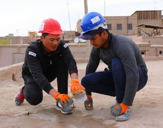在烏茲別克斯坦希瓦古城哈?!つ吕聨焓矂e吉清真寺,中方文物修復人員指導烏方工作人員修復清真寺屋頂。