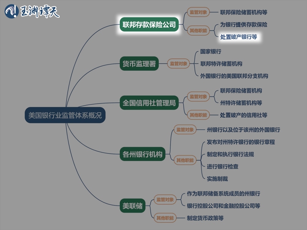 上圖是美國聯(lián)邦銀行業(yè)監(jiān)管體系的主要部門,可以看到,這個(gè)監(jiān)管體系覆蓋美國銀行業(yè)的上中下游,而FDIC職責(zé)之一是處置美國破產(chǎn)銀行。