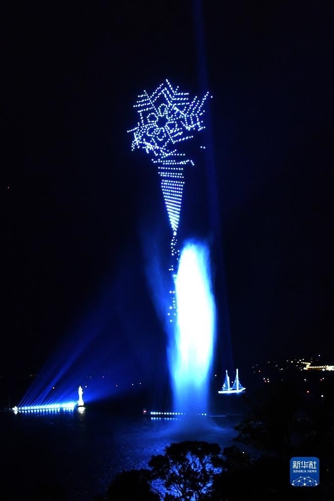 當晚,無人機光影音樂秀在瑞士日內瓦湖上舉行,超過1350架無人機點亮夜空,吸引市民駐足觀看。新華社記者 連漪 攝