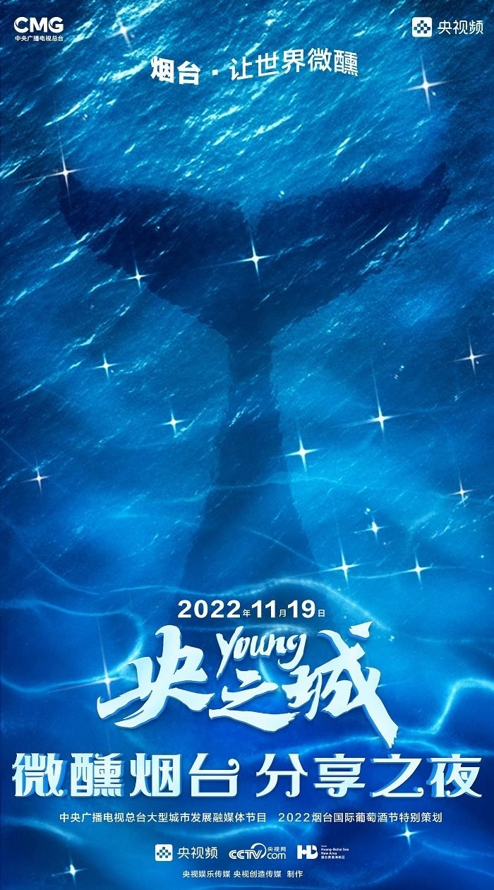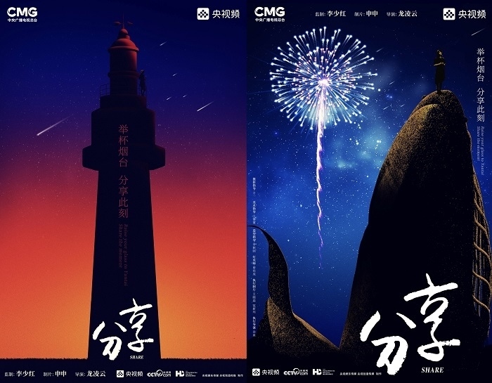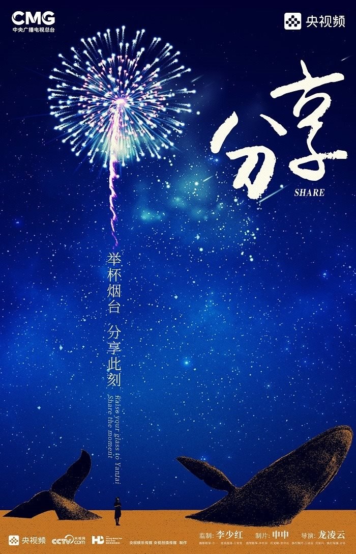 田雨峰在拍攝短片海報用圖的時候,首先確定了畫面中最突出的形象元素,同時也是交代短片故事發(fā)生地的地標(biāo)性雕塑——“孤獨的鯨“。這個雕塑如今是煙臺開發(fā)區(qū)金沙灘的網(wǎng)紅打卡地,網(wǎng)友為其起名”鯨落“。碩大的鯨魚從淺海處躍出海面,魚頭和魚尾凌空飛躍,其身體的一部分似藏在沙灘里。這是一個在真實生活中不會出現(xiàn)的景象,充滿了動畫般的奇幻想象,位于煙臺碧藍(lán)的海邊,又天然地帶上了一點浪漫的色彩。短片中”舉杯煙臺,分享此刻“的Slogan綴在尾聲,分享的正是煙臺這座城市獨有的沙灘、夜空、煙火和人間。短片中可以娓娓道來般逐漸交代,但在海報里,二環(huán)用畫面底部金色沙灘上”孤獨的鯨“,畫面上方如大海般湛藍(lán)的星空,星空中綻放的煙花,鎖定了地球上唯一的煙臺。田雨峰鏡頭中短片主角的人物照被二環(huán)拼貼到童話般色彩斑斕的畫面里,被著意縮小了的黑色小女孩于是成為一切奇幻、浪漫想象的迸發(fā)之源,和世界分享一個妙趣橫生的想法。