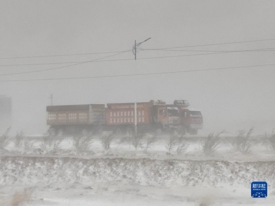 5月20日,在蒙古國(guó)蘇赫巴托爾省,貨車在暴風(fēng)雪中行駛。新華社發(fā)(蒙古國(guó)蘇赫巴托爾省BBS電視臺(tái)供圖)