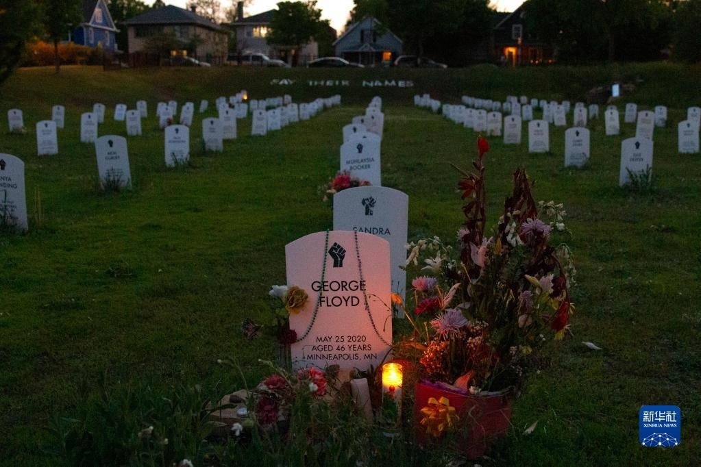 這是5月25日在美國(guó)明尼蘇達(dá)州明尼阿波利斯市拍攝的弗洛伊德墓碑前擺放的鮮花。新華社發(fā)(比利·布里格斯攝)