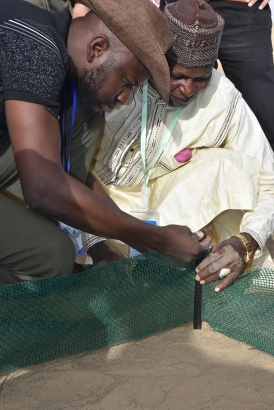 這位卡諾州環(huán)境部生態(tài)和林業(yè)主管按照中國專家的講授和示范,把條狀的可降解乳酸纖維沙袋灌滿沙子,擺成方格形狀,又拿起沉甸甸的鐵錘,把小樁子敲進(jìn)沙地里,圍上高密度固沙網(wǎng)。